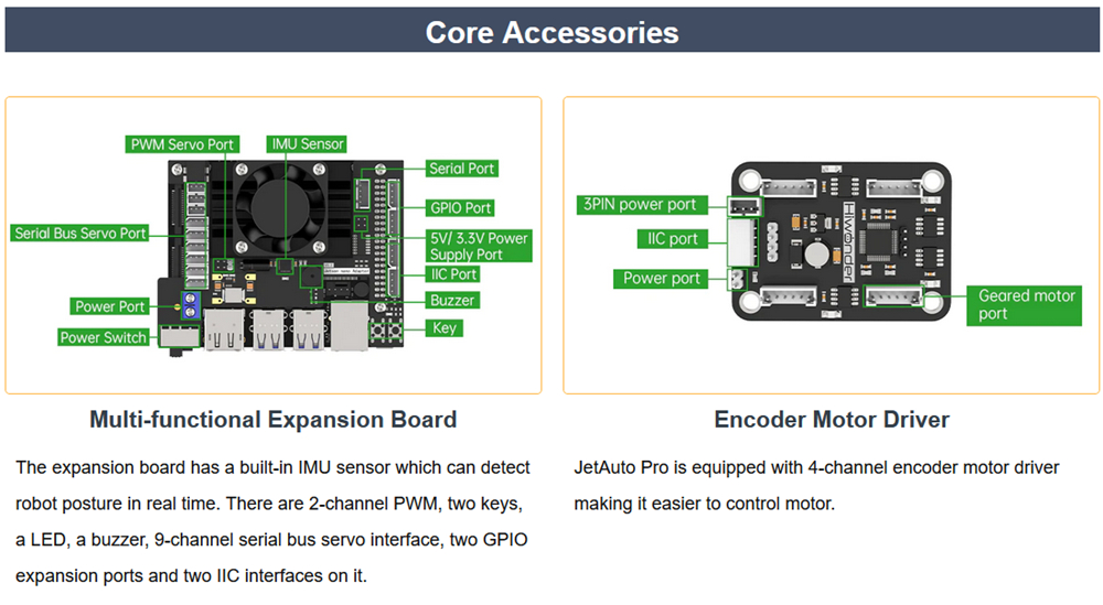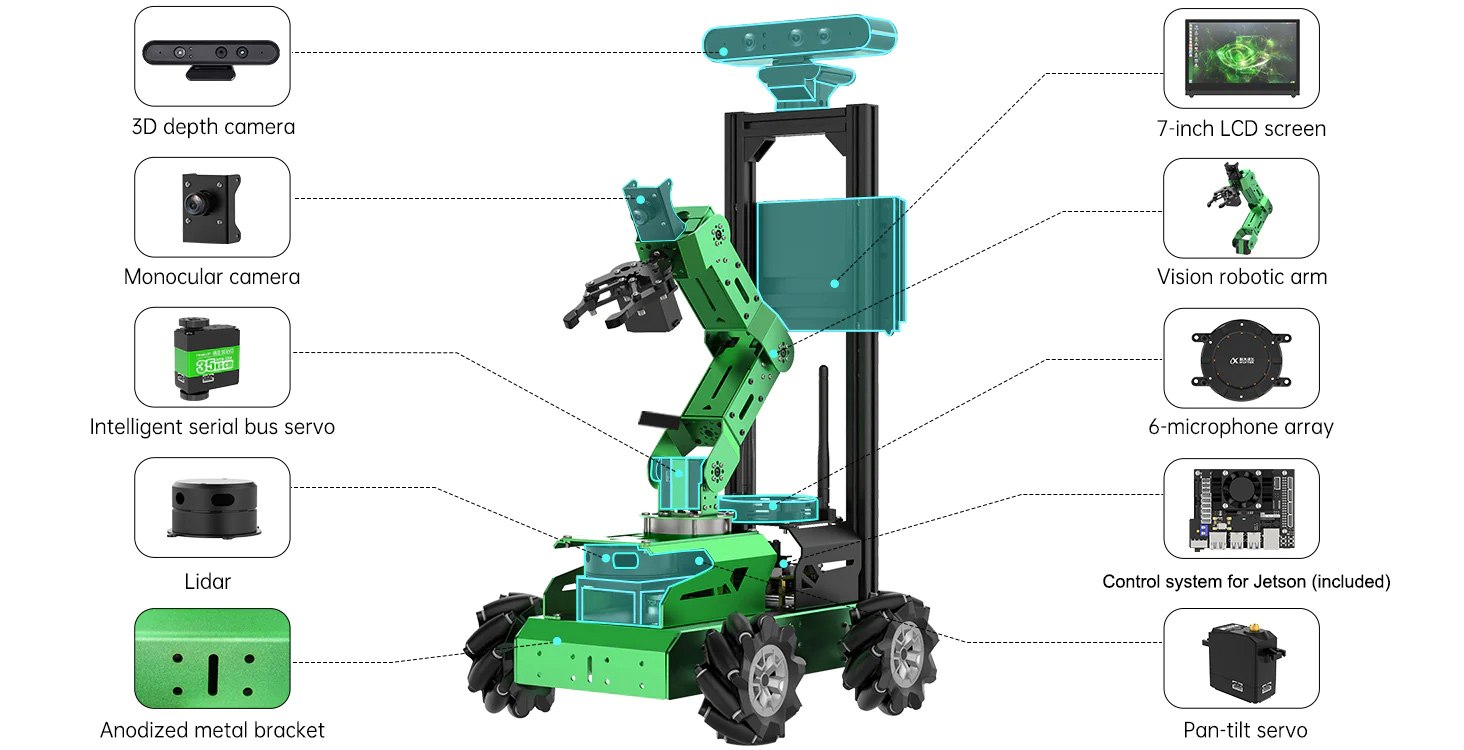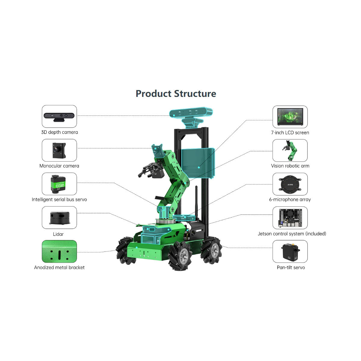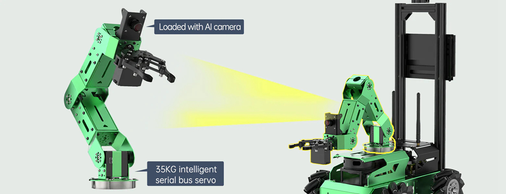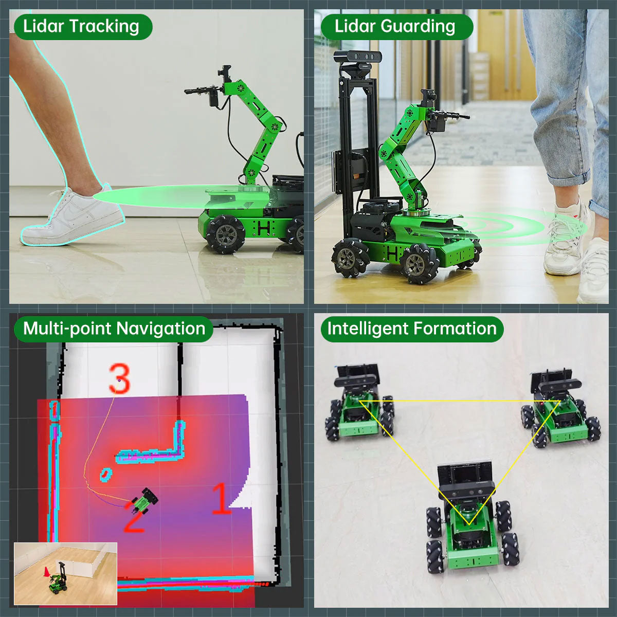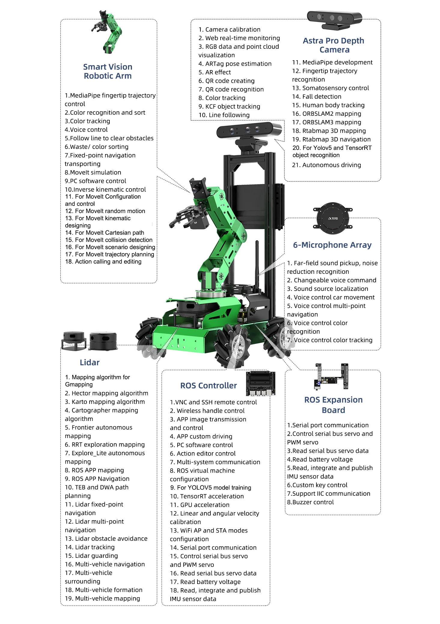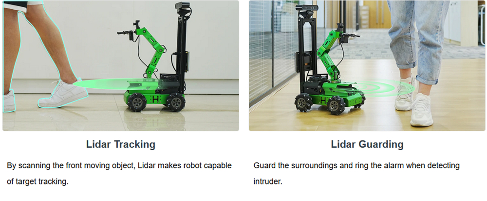 JetAuto Pro is a comprehensive 2 in 1 ROS robot tailored for ROS learning. It is loaded with board for NVIDIA Jetson Nano, AI vision robotic arm, high-performance encoder motor, Lidar, 3D depth camera and 7-inch screen, which open up more functionalities. Robot motion control, mapping and navigation, path planning, tracking and obstacle avoidance, autonomous driving, intelligent picking, simulation for MoveIt, somatosensory interaction and voice interaction all can be achieved!