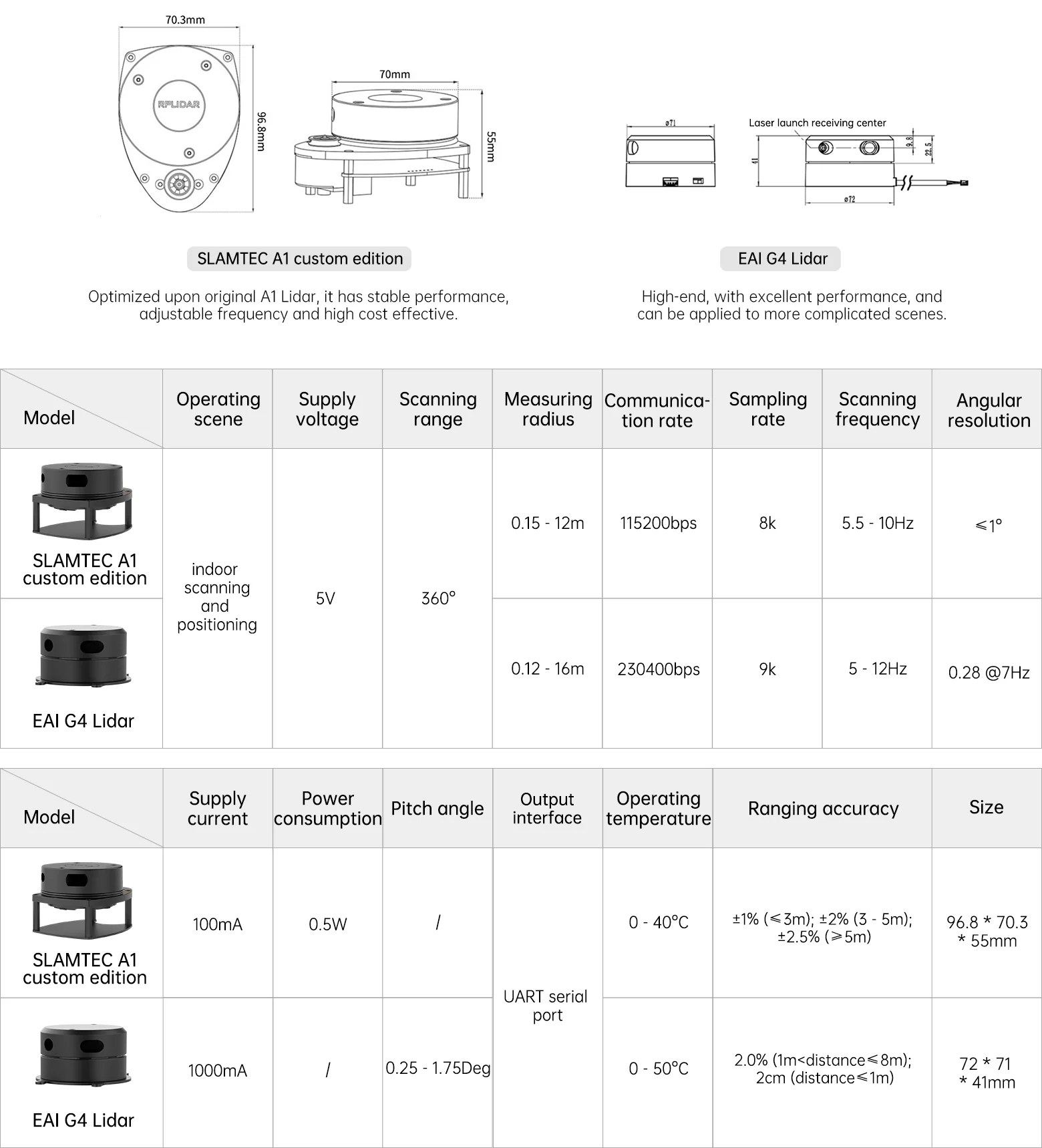SLAMTEC A1 custom edition (by default) and EAI G4 Lidar (optional).