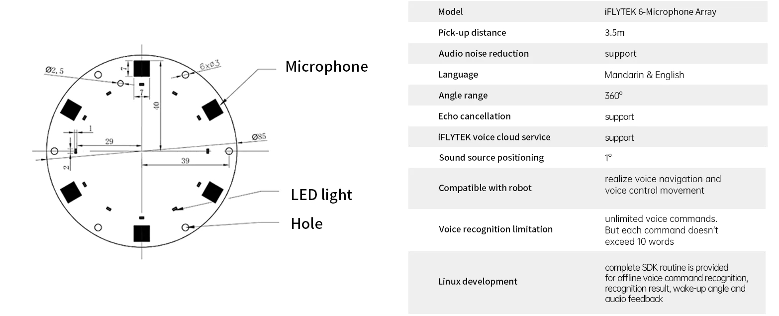 This 6-microphone array is adroit at far-field sound source localization, voice recognition and voice interaction. In comparison to ordinary microphone module, it can implement more advanced functions.