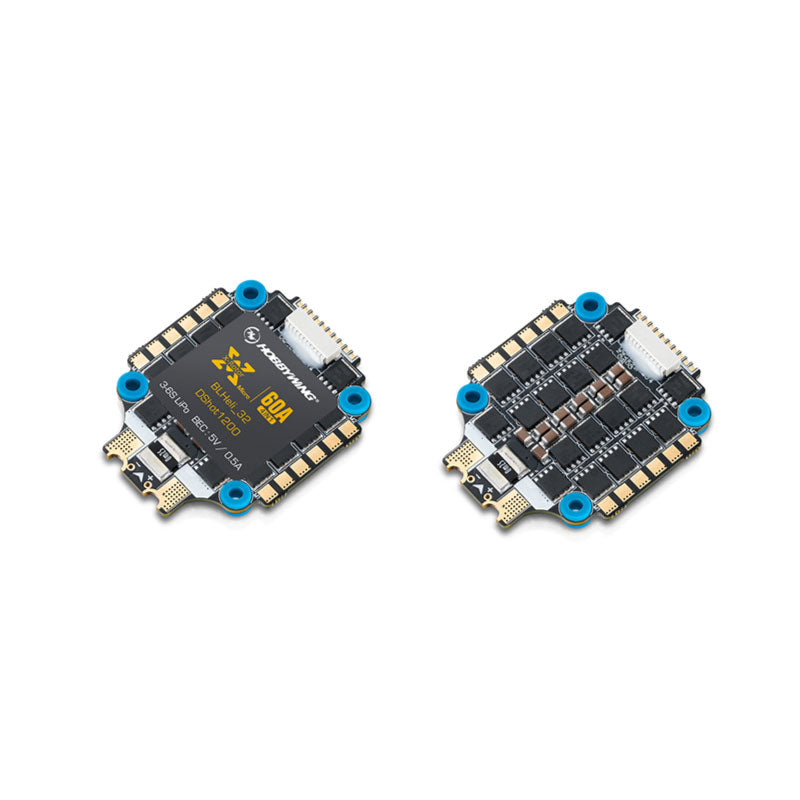 With a similar size of a FC, the 4IN1 ESC includes 4 high performance 60A BLHeli_32DShot1200ESCs, a 5V BEC which can provide power for devices (i.e. FC), and a voltmeter which allows FC to monitor the amp & volt in real time. Two ways for connecting the ESC to a FC: 1) Connecting via soft cables. 2) Soldering via solder tabs are provided for selection. And the shock-absorbing design of mounting holes effectively reduces the external vibration's impact on high-sensitivity components and provides great shock-absorbing protection to upper devices (i.e. FC) . This ESC is designed for FPV racing.