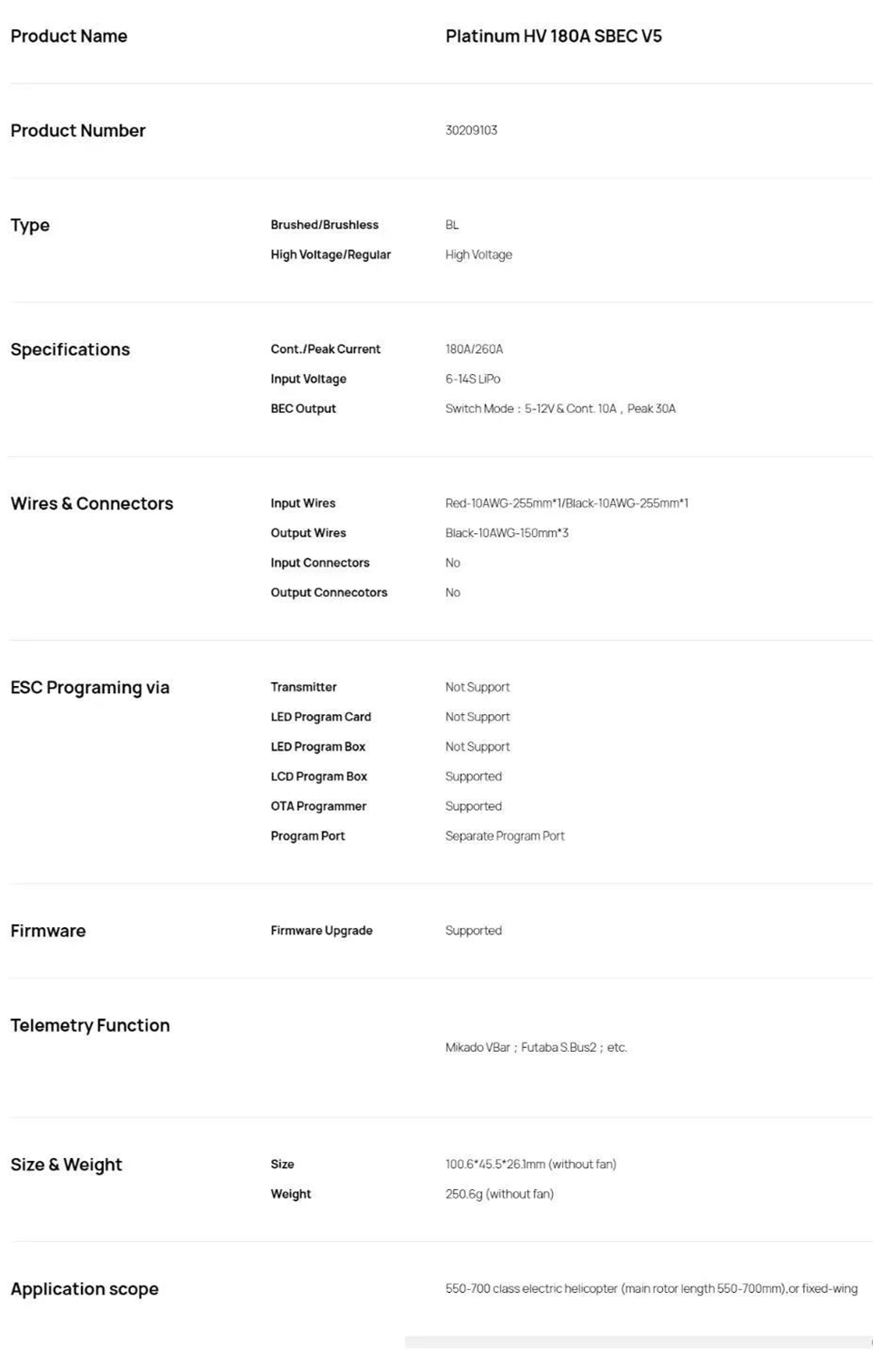 Hobbywing Platinum 180A V5 Compact Brushless ESC 6-14S Lipo Input for 550-700mm Class RC Drones Helicopter
