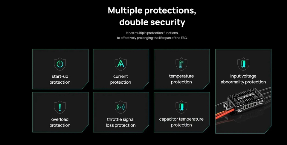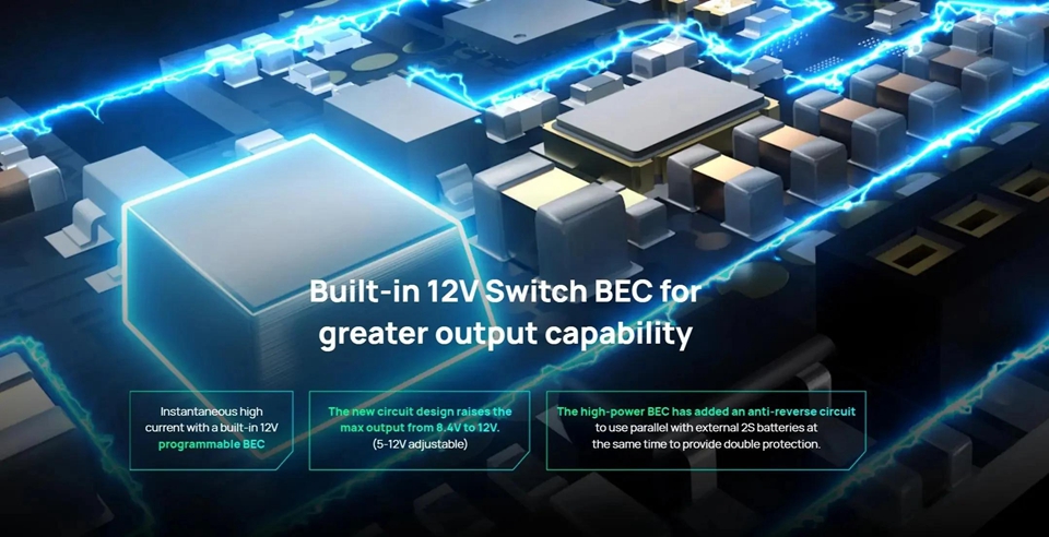 - BEC output: switch mode: 5 - 12V & continuous 10A, instantaneous 30A