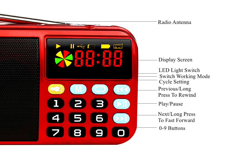 Turn on the radio, press the M button to select modes such as FM. Long press the play button to search for a radio station. The station will be automatically saved. Press the previous/next button to select saved radio stations.
