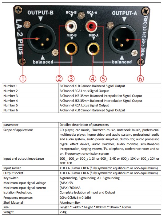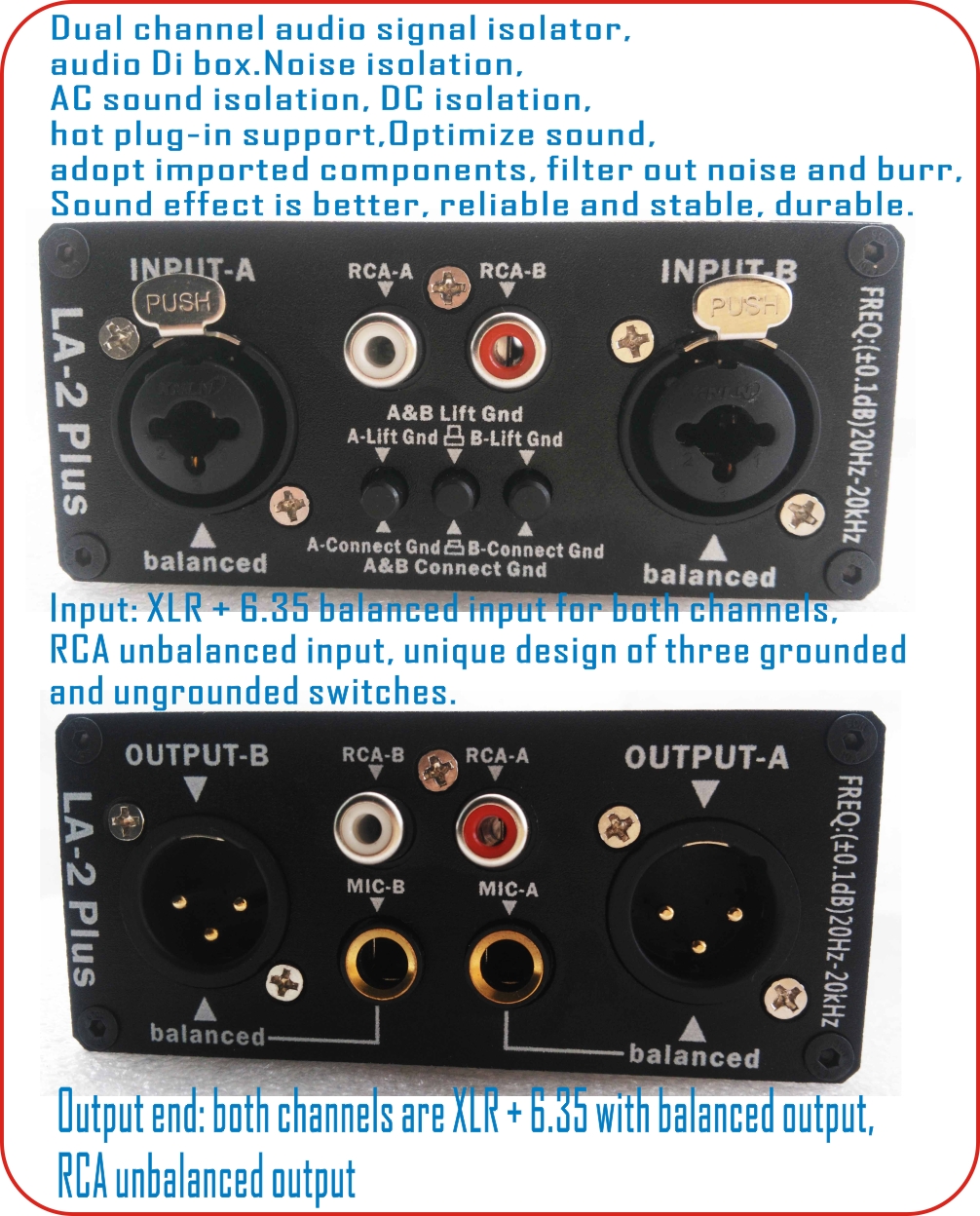 LA-2Plus is suitable for all large-scale outdoor and indoor performances, lightning protection, sound engineering, conferences, entertainment venues, exhibition halls, Karaoke rooms, home theaters, CD players, car music, Bluetooth music, recording systems and a series of audio equipment systems. It is a good helper for audio system cascade to eliminate noise. Almost all audio equipment serial connections can use the audio signal noise isolator to isolate and eliminate noise and hum, or it can be used as a passive DI box and supports hot plugging. It can eliminate impact sound when your equipment is plugged and unplugged in the normal operation of XLR cable and JK6.35mm cable. Eliminate the damage to your equipment caused by improper operation.