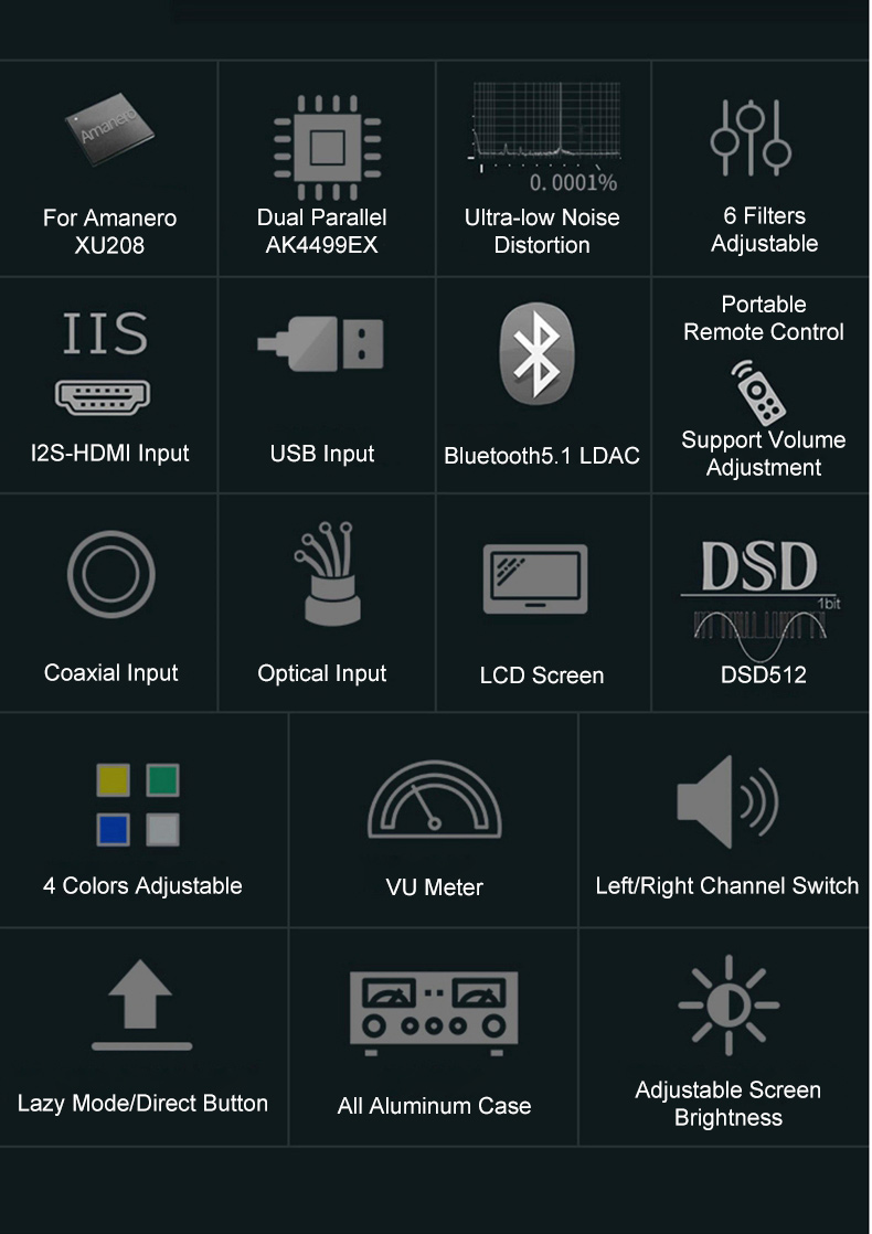 - USB and HDMI-compatible: support up to DSD512 source code, PCM768K/32bit