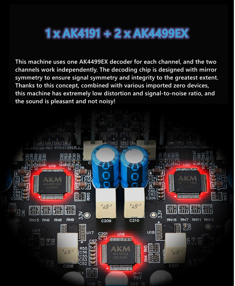 - This machine uses one AK4499EX decoder for each channel, and the two channels work independently. The decoding chip is designed with mirror symmetry to ensure signal symmetry and integrity to the greatest extent. Thanks to this concept, combined with various imported zero devices, this machine has extremely low distortion and signal-to-noise ratio, and the sound is pleasant and not noisy.