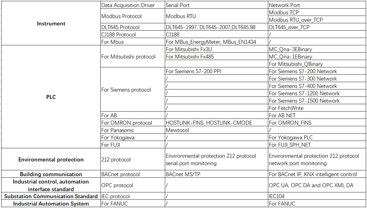 * As a Modbus RTU and Modbus TCP server, the gateway provides data to the outside world. It supports 0x, 1x, 3x, 4x, these 4 functional areas. Supports int16, int32, float32 and various data types with big and small end changes.