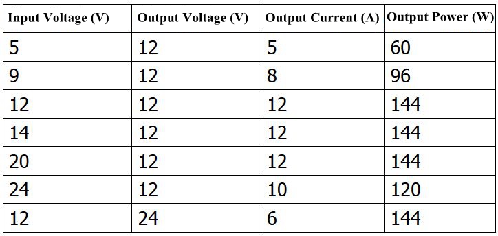 - Continuous output current: 12A, maximum 14A (input 14V, output 12V).