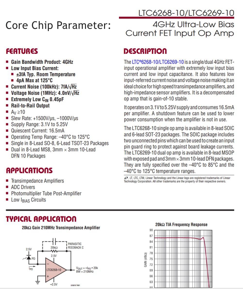LTC6268-10 High Speed Photoelectric Detection Module Ultra-low Bias Current 210MHz Transimpedance Amplifier