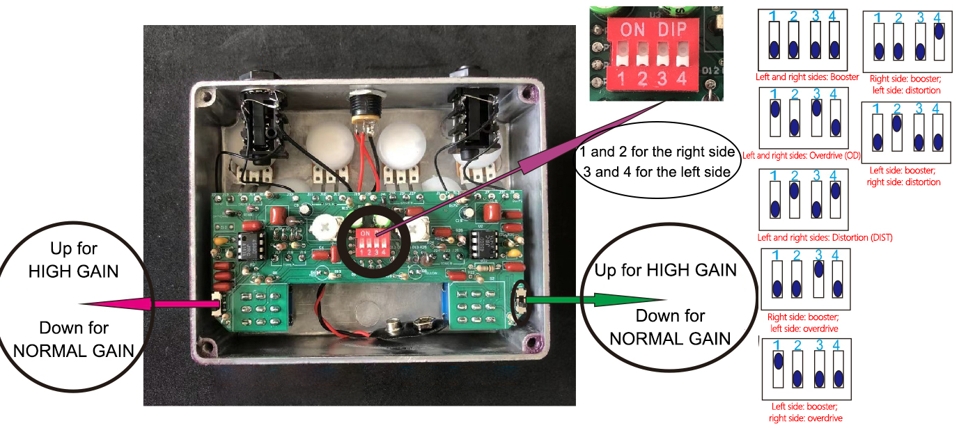 The overdrive pedal integrates 4 modes, including normal gain, left high gain, right high gain, and dual high gain mode.