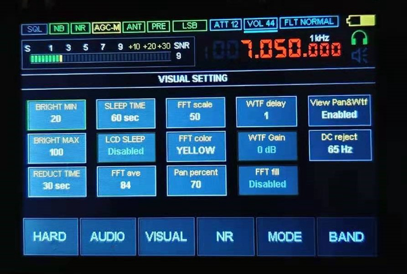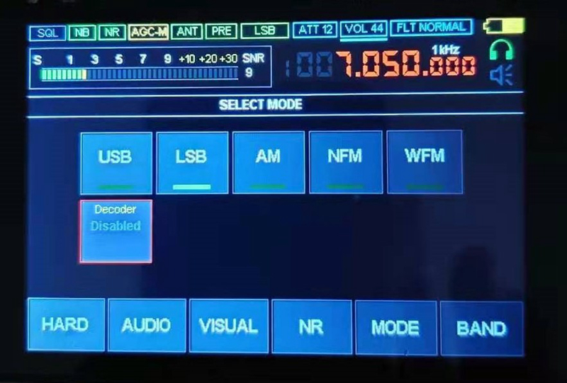 4. Receiving Mode Conversion: Long press the upper right knob for 3 seconds and then release it. There will be 5 receiving modes in the middle of the screen. Use your finger to switch between USB, LSB, AM, NFM, WFM. If you don't want to switch, you can click the knob in the upper right corner again to exit.