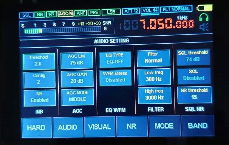 6.2. AUDIO: NB/electric spark noise, Thes/start control value and Config/setting value: these two items have been set to 2, you can try it. NB/Switch: Dis on/Ena off. AGC/automatic gain control. AGC LIN/AGC peak value: Experimental adjustment. MANUAL/manual control: experimental adjustment. AGC MODE/AGC mode: OFF, fast, normal, slow, very slow. EQ (Equalizer) EQ TYPE/Equalizer switch and selection: Click first, then use the Volume encoder to open and select; including light music, live, club, rock, bass, jazz, pop, language. WFM Stereo/FM Stereo: Only earphones. NR/DSP noise reduction Thes/setting value: Set according to hearing sense. SQL Thes/setting value. SQL switch.