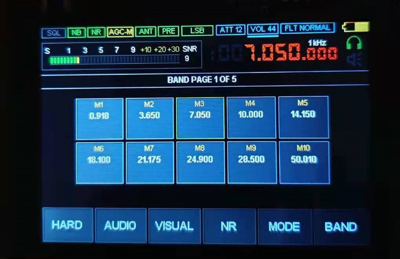 6.5. BAND (Band) Band key, you can switch between bands and memory selection. The memory is divided into 5 pages, 10 per page; it can be stored in a certain memory arbitrarily. Ready to call. When storing, first adjust the frequency, mode, step, AGC, RF Gain, FLT parameters, PRE and other data, then select the memory page and location, press and hold the memory frame with your finger, and release it after hearing the beep.