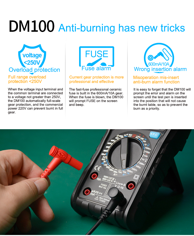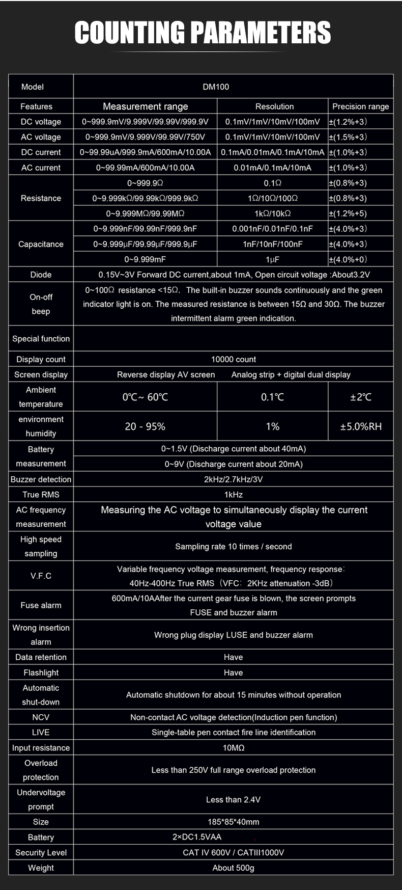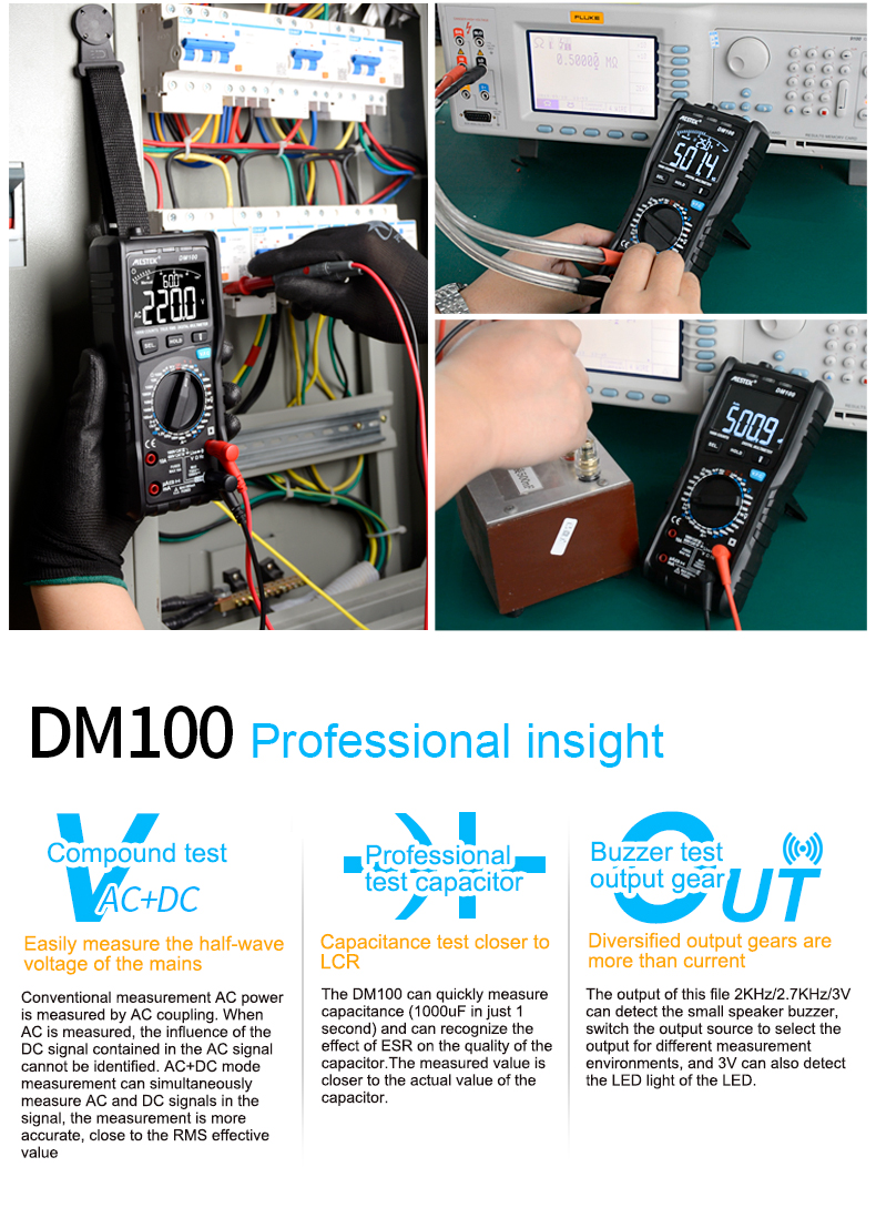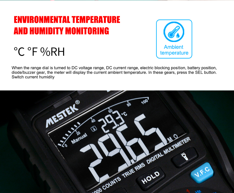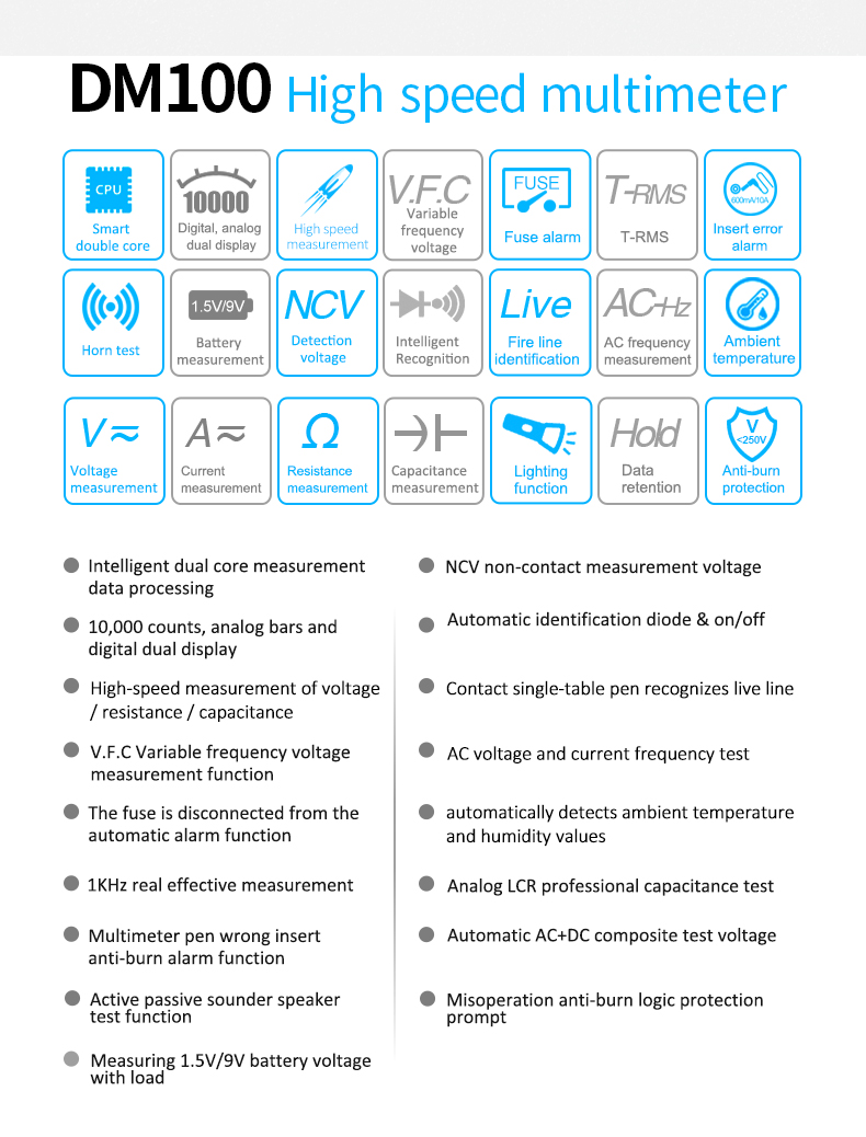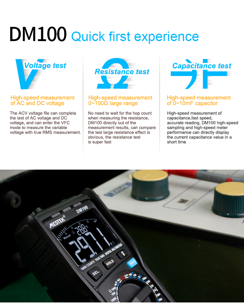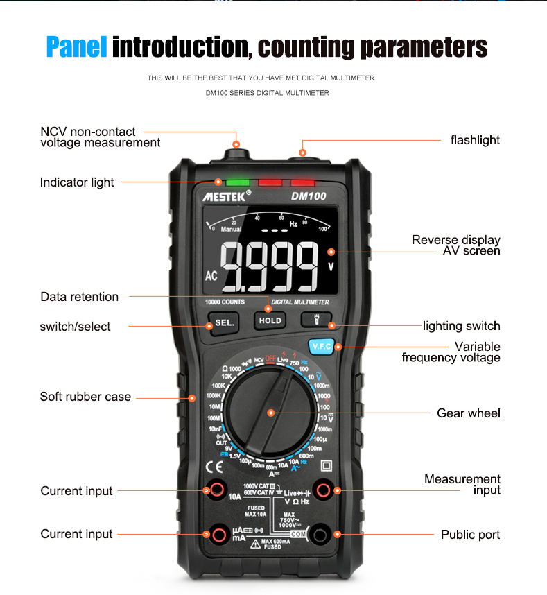 MESTEK DM100 Digital Multimeter Manual Voltage Current Resistance Tester Meter True RMS 10000 Counts