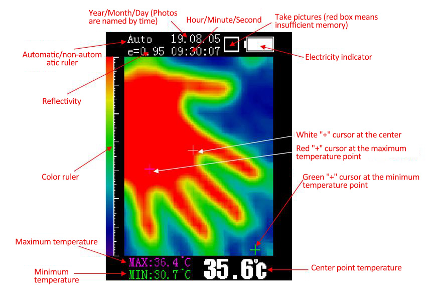 3. Setting parameters/time: Long press left/right key to enter on-screen temperature range/reflectance/time setting (the number is bright red), press the left/right key to adjust, and press the middle key to confirm. Long press the left/right key to quickly exit the setting.