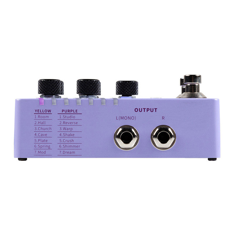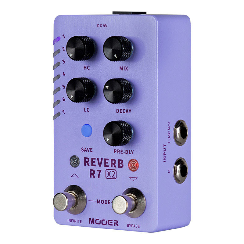 - The R7 X2 double-pedal stud stereo reverb monoblock perfectly combines the world-renowned new mini-series R7 and A7 into one. There are 14 stereo reverbs that are distinguished from classic to modern. In terms of adjustment, in addition to the commonly used dry-wet mixing ratio (Mix), attenuation (Decay), and pre-delay (Pre-Delay), it also provides two options of high-cut HI CUT and LO CUT low-cut. Users can choose according to their own Like to adjust the muddy or clean stereo reverb sound.