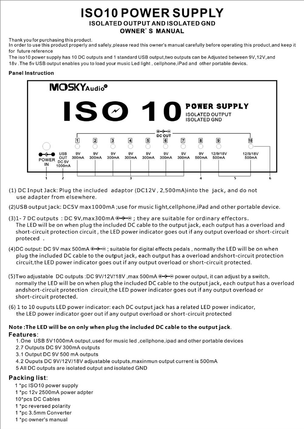- 10 isolated DC outputs: the 1st to 7th output DC 9V 300mA, the 8th output DC 9V 500mA, the 9th and 10th output DC 9/12/18V adjustable voltage, 500mA current.