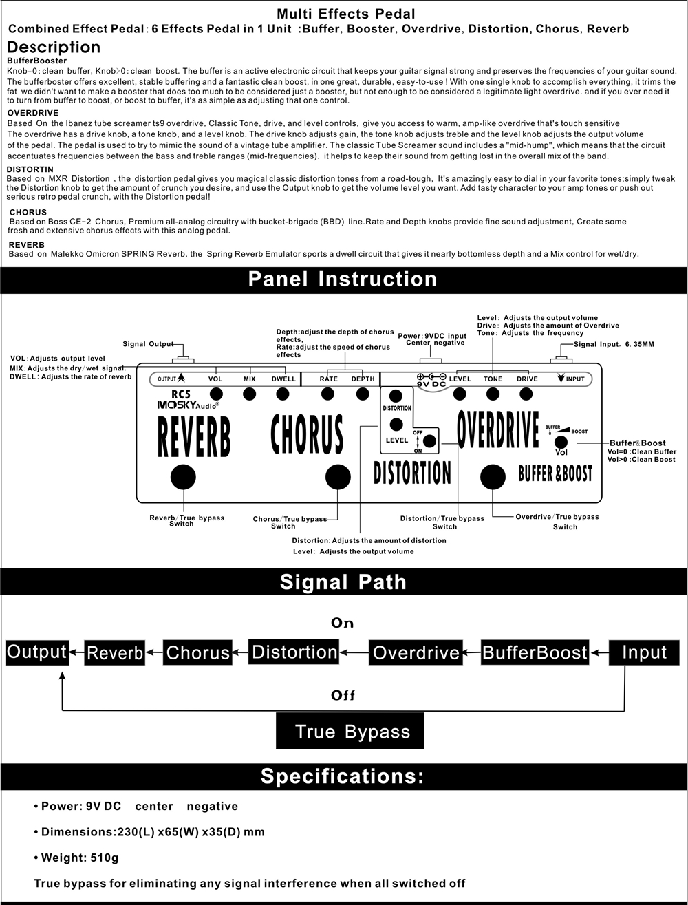 - Combines effect pedal: 6 effects pedal in 1 unit: Buffer, Booster, Overdrive, Distortion, Chorus, Reverb.
