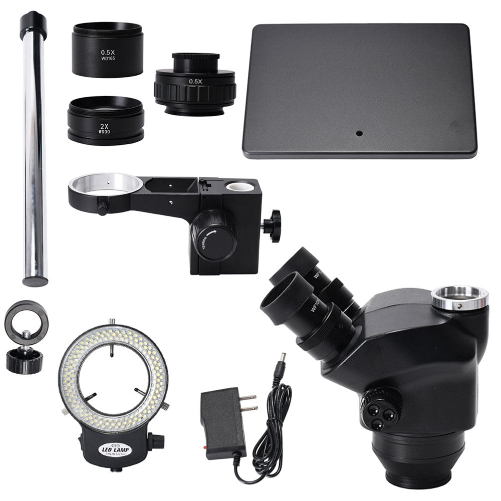 This stereo microscope has a 144-LED ring light that offers super widefield optics and 3.5X-100X zoom magnification power with a cool light illumination system. It is an ideal instrument for industrial inspection and/or biological lab applications. This microscope is perfect for gemologists, manufacturing engineers, dental lab technicians, and anyone in electronic and semiconductor industries.