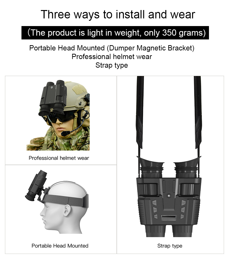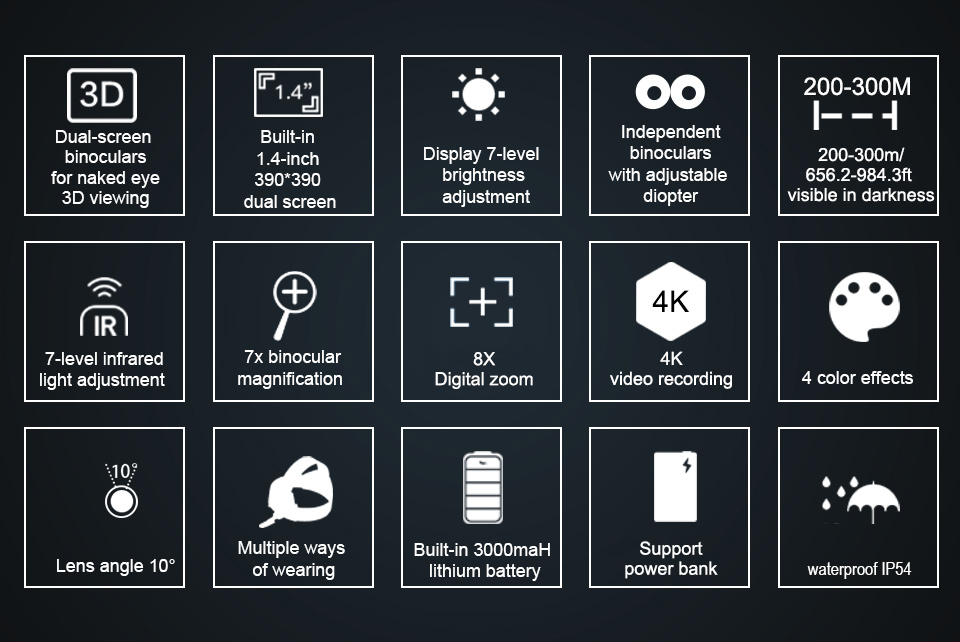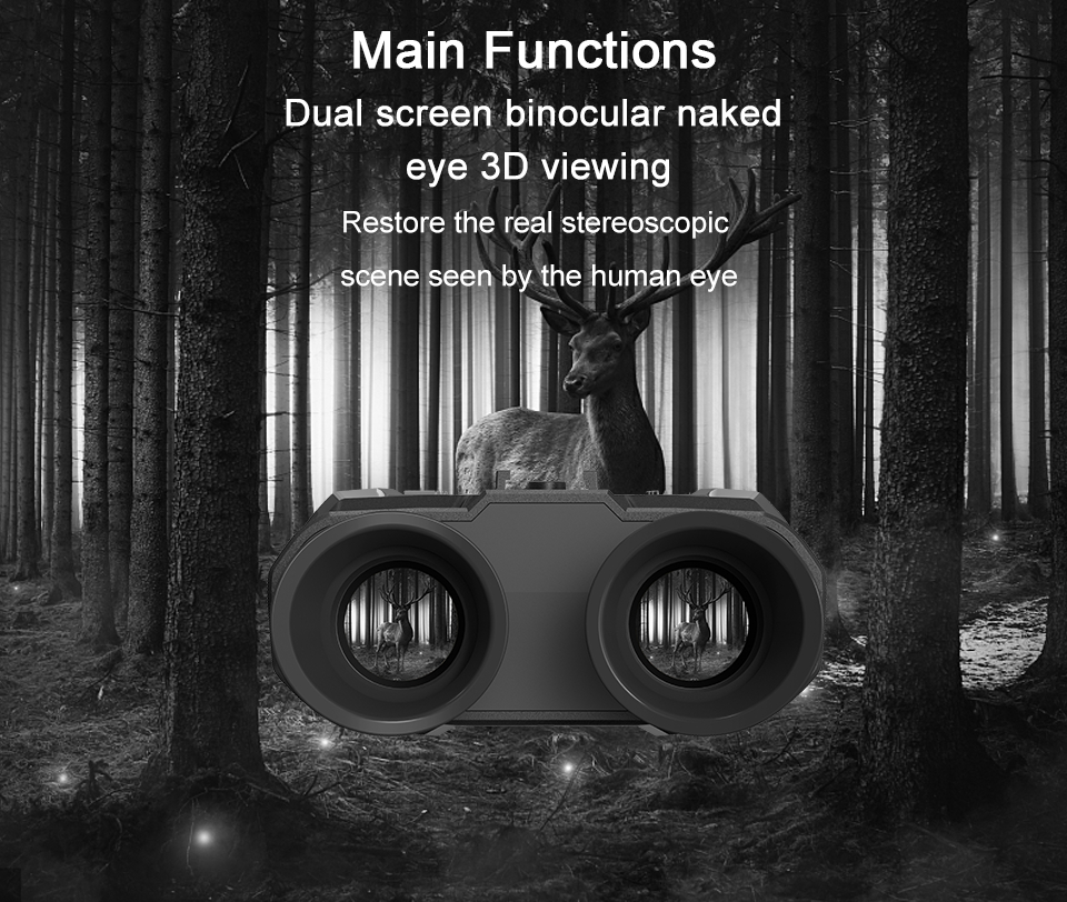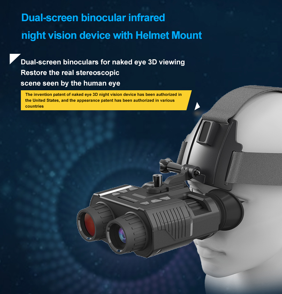 Dual-screen binocular glasses use naked-eye 3D display technology, restoring the real three-dimensional scene seen by human eyes (the patent of naked-eye 3D night vision device has been authorized in many countries).