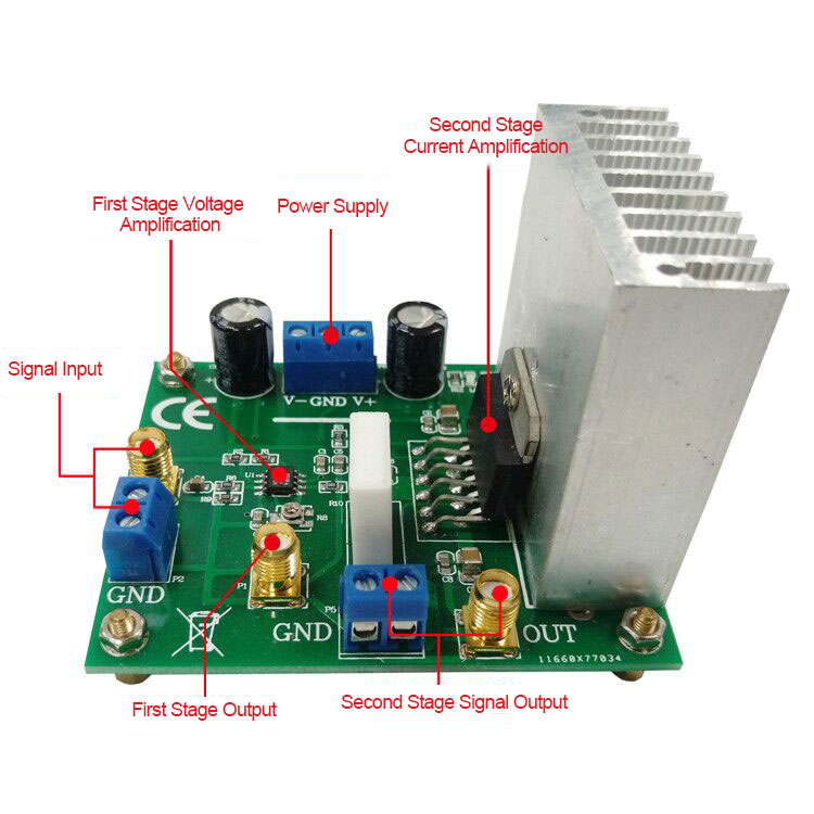 OPA541 module is a high-voltage high-current power amplifier that can continuously output currents up to 5A. It is suitable for motor drive, speaker drive, transformer drive and audio amplifier. It can also amplify triangle wave, sine wave and square wave signals.