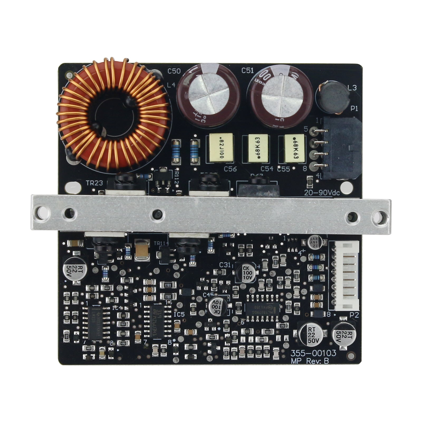 The 500A is a 500 W at 4 Ω general purpose high-quality class D audio amplifier. It can be powered from the DC hanger bus of the 500ASP and the 1000ASP. This way, 2-channel or 3-channel solutions can be created for either stereo amplifiers or 2- or 3-way active speakers.