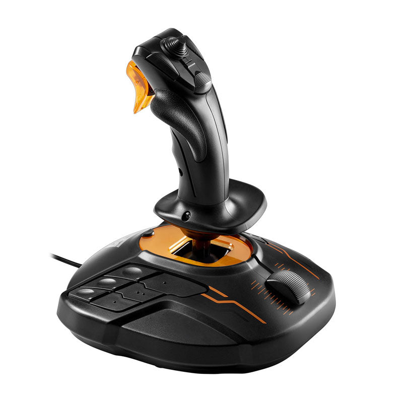 - The T.16000M FCS features 4 independent axes, including twist (controlled by rotating the stick), 16 action buttons with "braille"-style physical button identification, one 8-way Point of View (PoV) hat switch and an ergonomic trigger. Its striking orange accents and backlighting bring gamers' immersion to a whole new level.