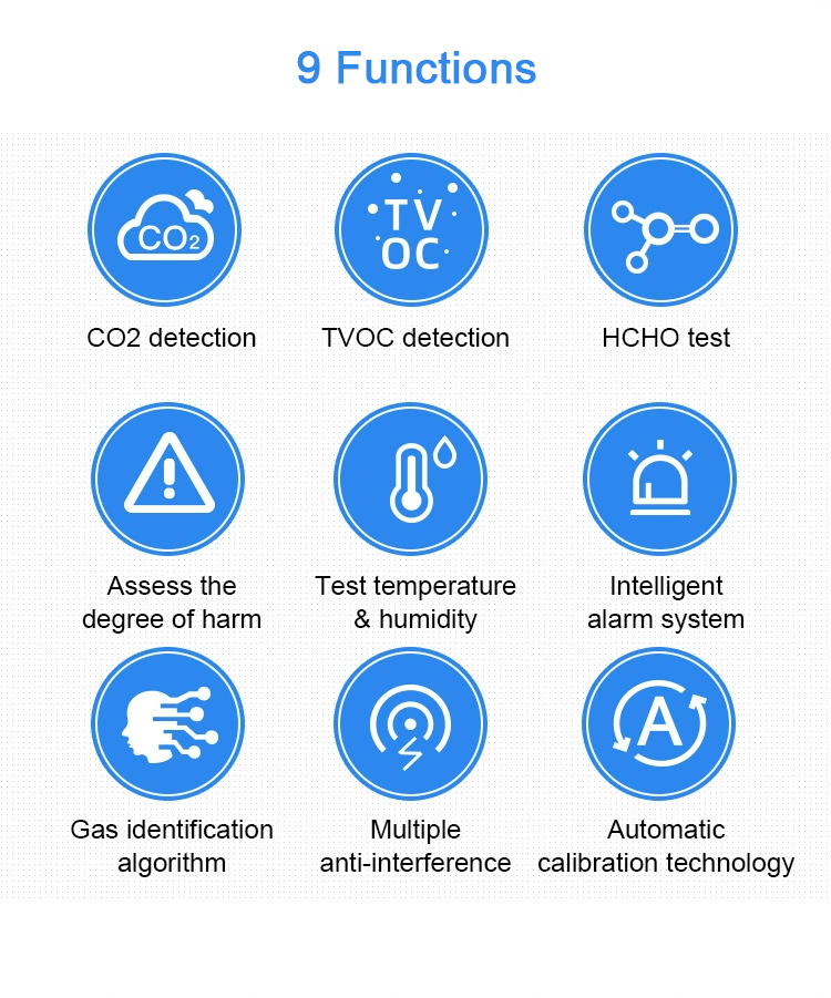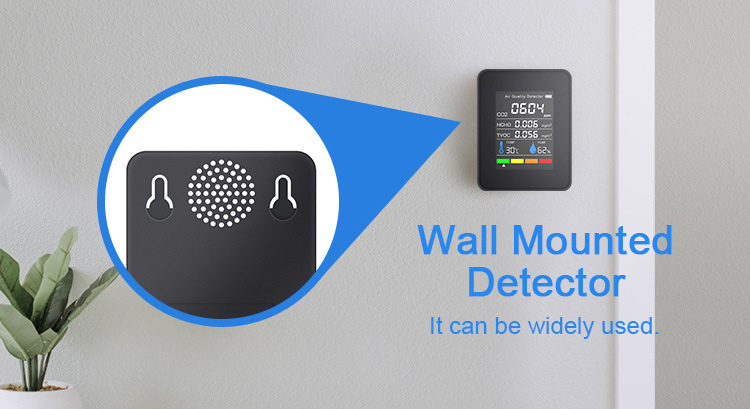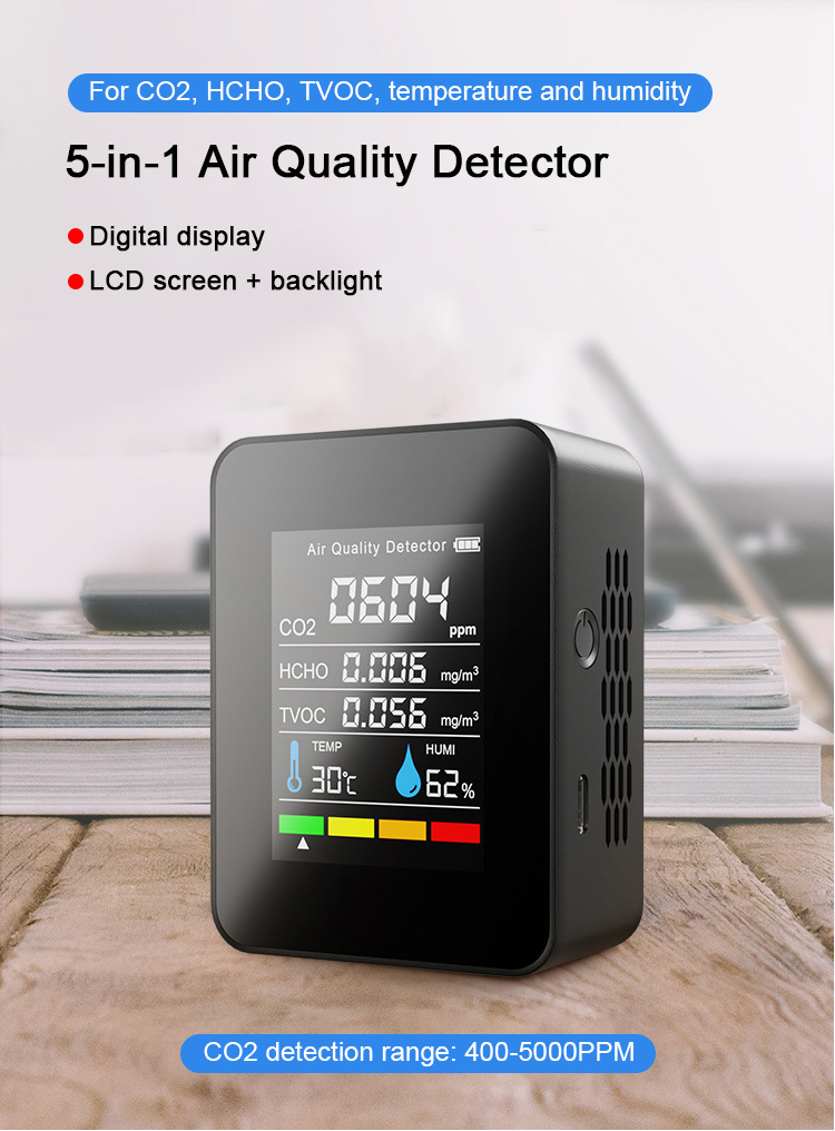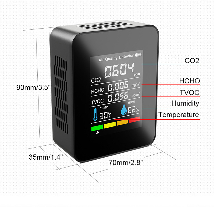 - The air quality tester can be used to detect CO2, HCHO, TVOC, temperature and humidity