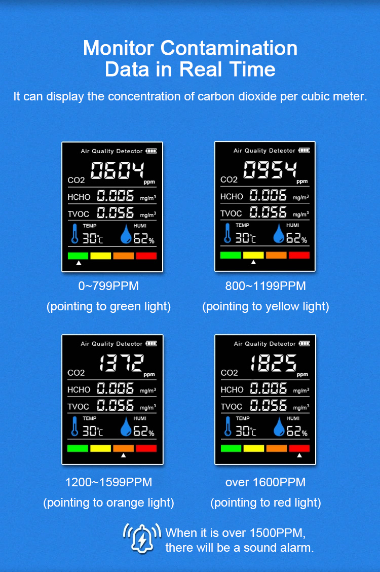 - Monitor contamination data in real time. It can display the concentration of carbon dioxide per cubic meter. CO2 indication: 0~799PPM (pointing to green light); 800~1199PPM (pointing to yellow light); 1200~1599PPM (pointing to orange light); over 1600PPM (pointing to red light). When it is above 1500PPM, it will sound an audible alarm