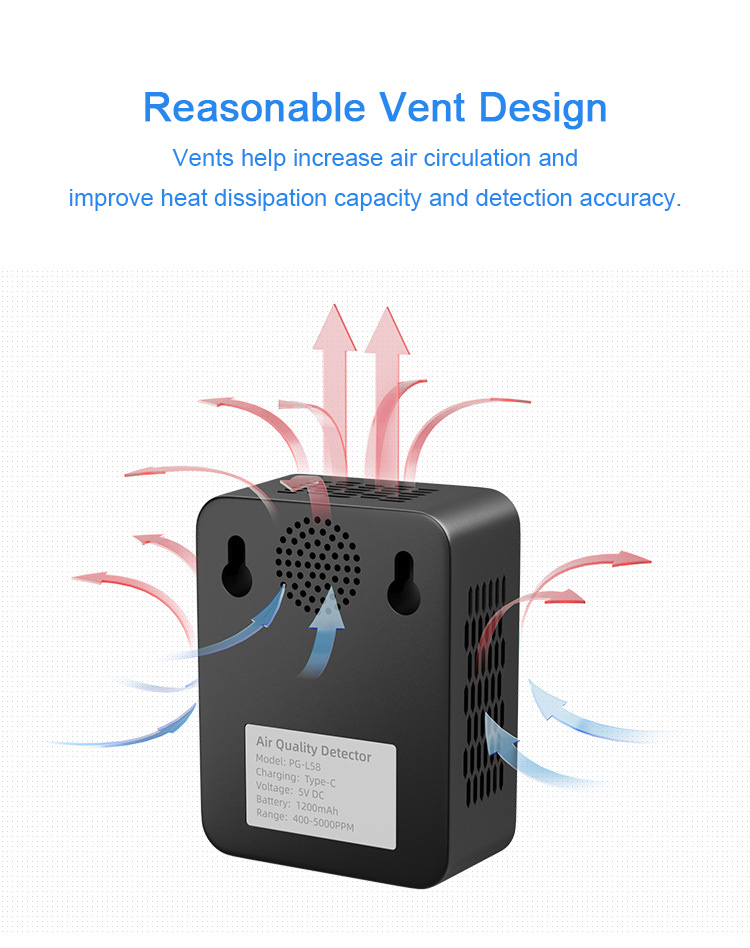 - CO2 detection range 400~5000PPM, HCHO detection range 0-0.6mg/m³ and TVOC detection range 0-2.0mg/m³