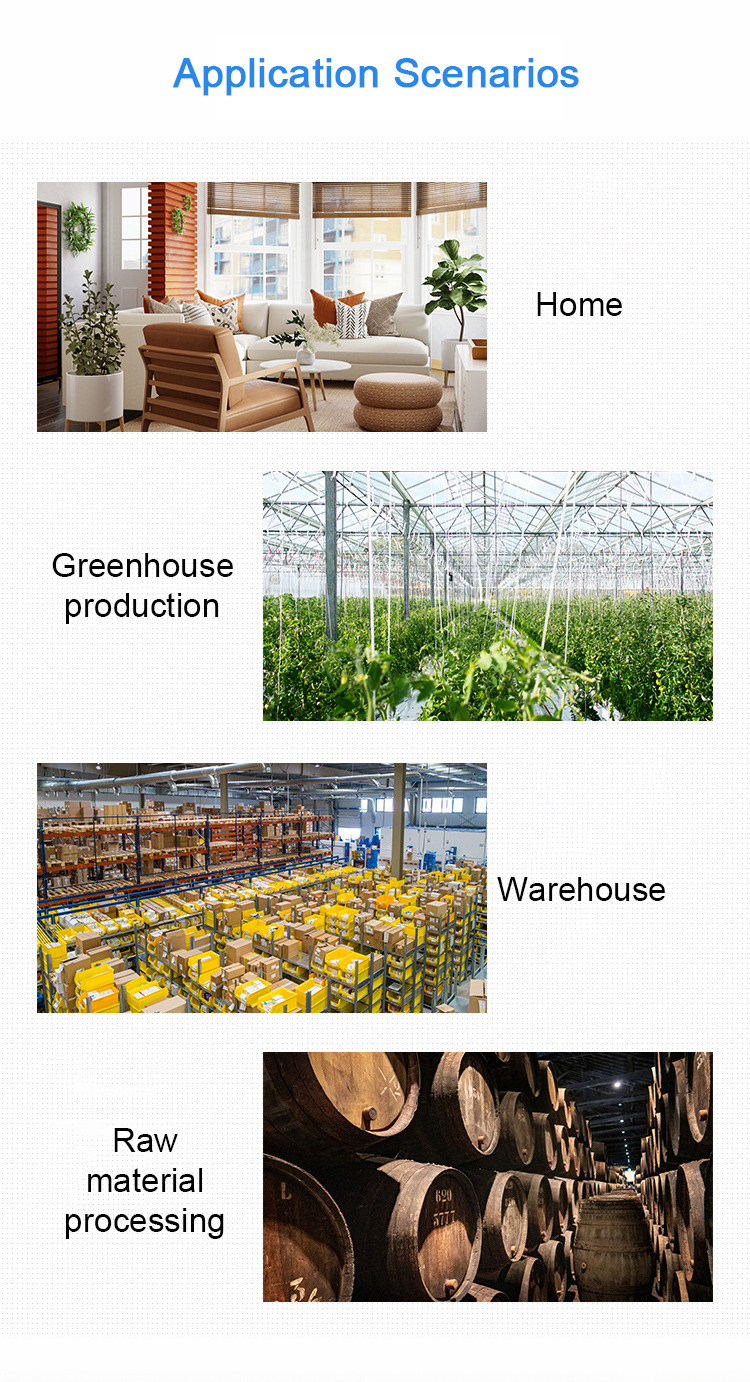 - Application scenarios: It can be applied to home, greenhouse production, warehouse, raw material processing, etc.