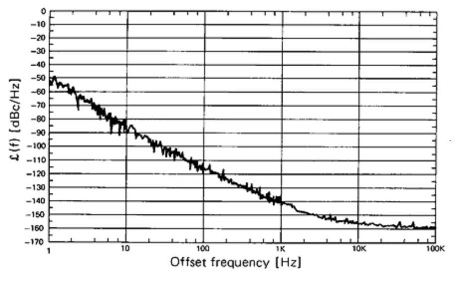 The phase noise diagram of 100M crystal used in this product. Because the loop filter bandwidth of this product is less than 10Hz, the phase noise other than 10Hz can refer to the above graph.