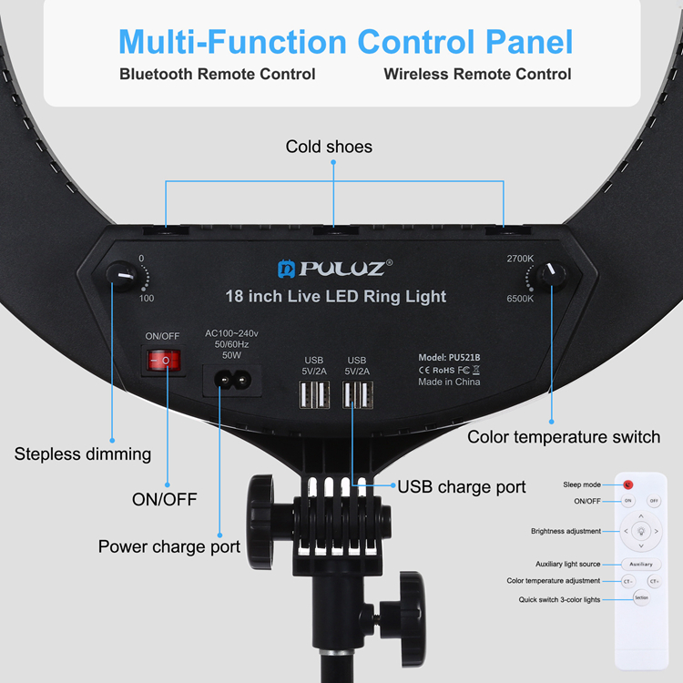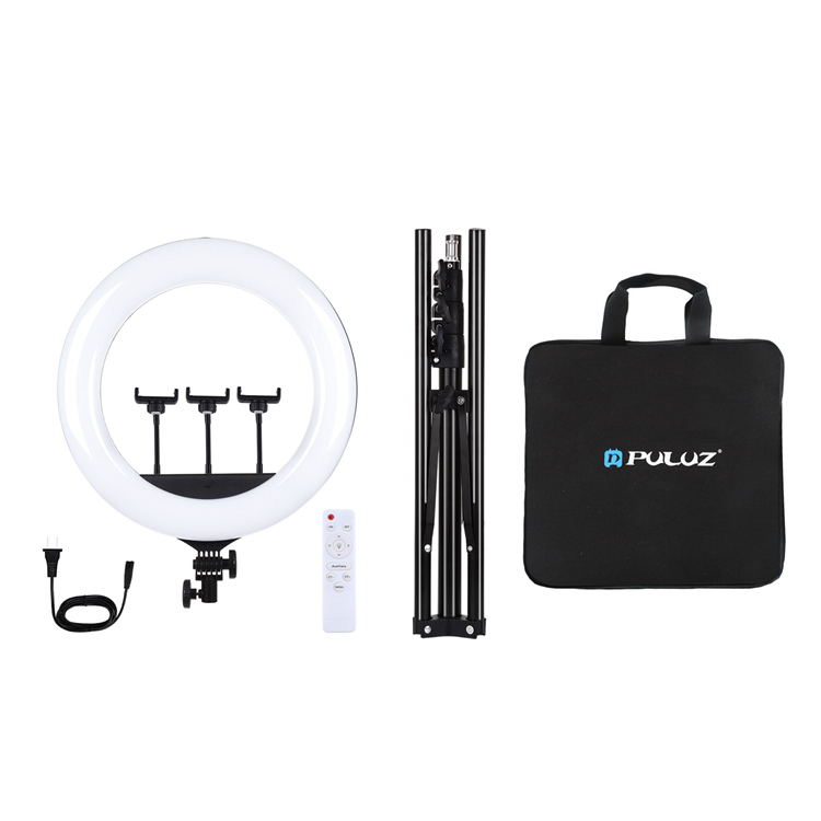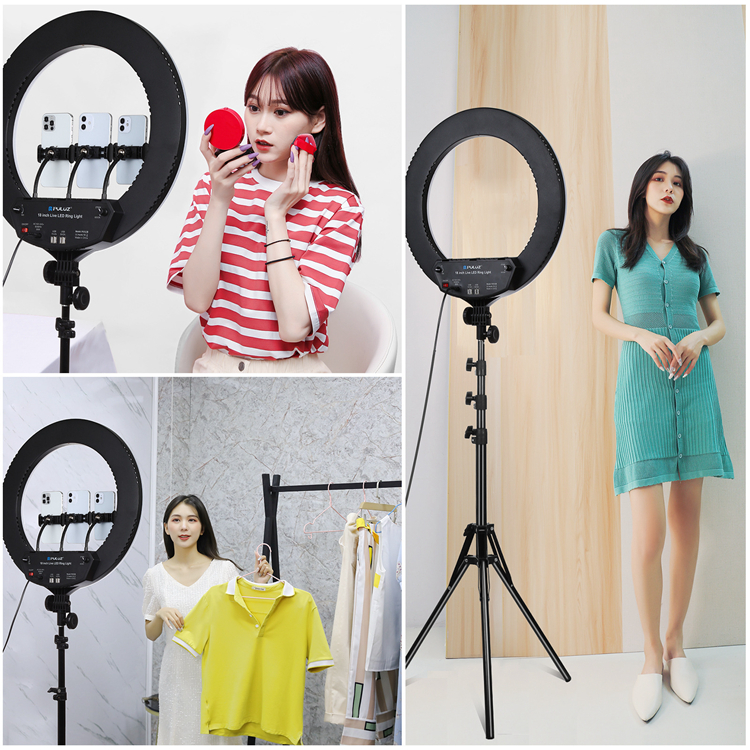 PKT3102 PULUZ 18 Inch Live LED Ring Light With Tripod Stand 70.9" 3PCS Phone Clamps & Remote Control