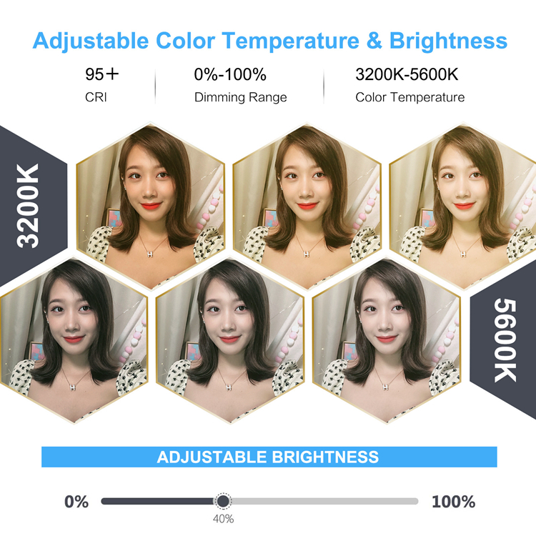 3. Lighting mode adjustable brightness for your choose, you can adjust the color and brightness very easily, great brightness can be achieved without installing extra colorful filters. Different colors of soft natural light illuminate your beauty in different occasions