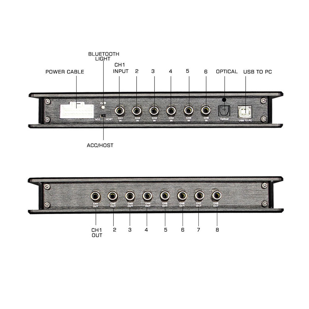- Port: 1 car dedicated interface/1 USB port/Optical input port/6 RCA input/8RCA output