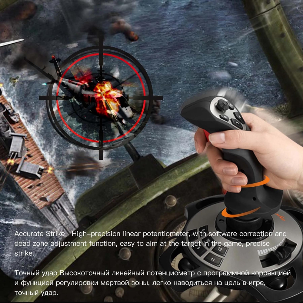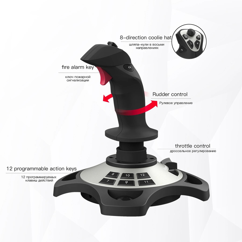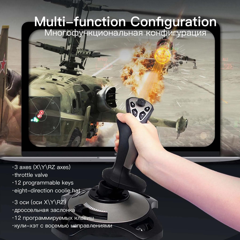 - Multifunctional configuration: 3 axes (X\Y\RZ axes) + throttle valve + 12 programmable keys + eight-direction coolie hat