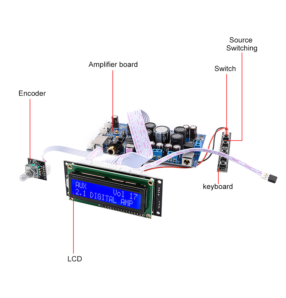- Encoder Functions: It turns clockwise to turn up, turns counterclockwise to turn down. Lightly press the encoder to switch among bass, treble, volume adjustment states. Long press the encoder to be in mute.