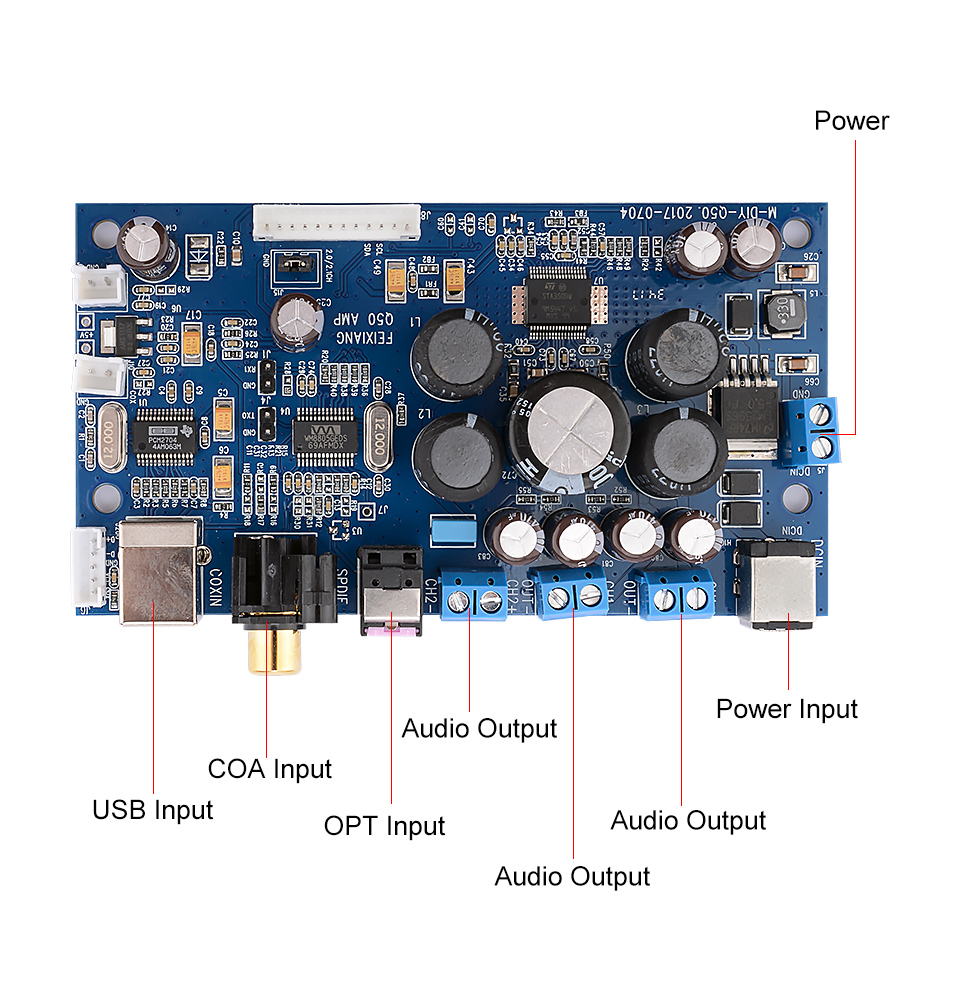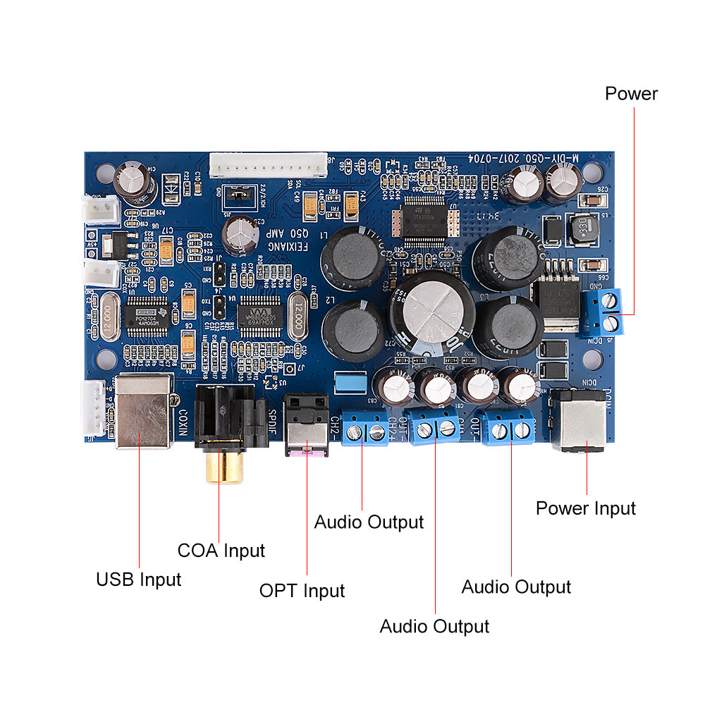 Q50 power amplifier board adopts pure digital amplification technology. Supports audio modes, including optical fiber, coaxial and computer USB inputs. USB high-end modules are suitable for computers, LCD TVs, set-top boxes, digital boxes, Blu-ray and HD-DVD devices. Each channel outputs 50W (in 2-channel mode), which can meet the listening requirements of most people.