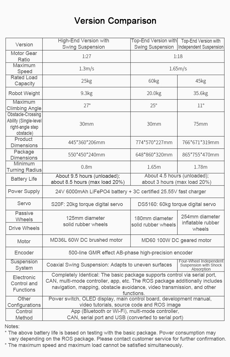 * It includes robot chassis, base controller (with driver), battery, charger, ROS main controller, depth camera and lidar. It is ready to run the ROS system out of the box.