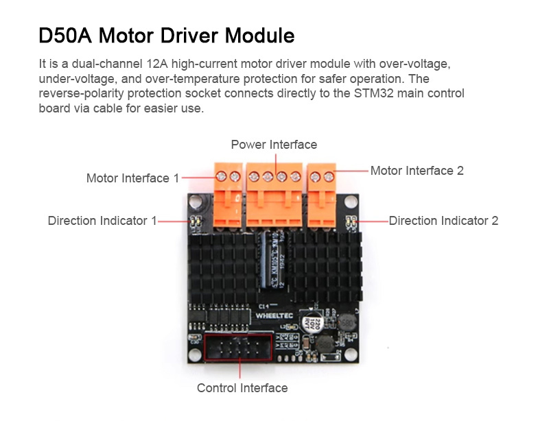 * It is a dual-channel 12A high-current motor driver module with over-voltage, under-voltage, and over-temperature protection for safer operation. The reverse-polarity protection socket connects directly to the STM32 main control board via cable for easier use.