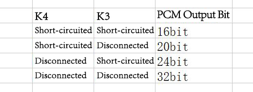 2. Set the output number of bits of the PCM output mode through K3 and K4 setting: