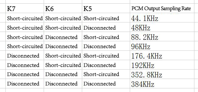 3. Set the sampling rate of PCM output mode through K5, K6 and K7 settings: