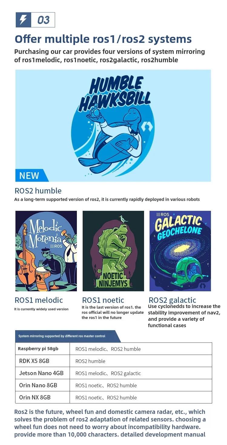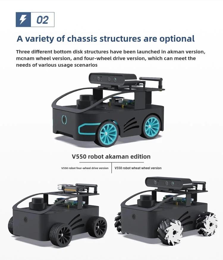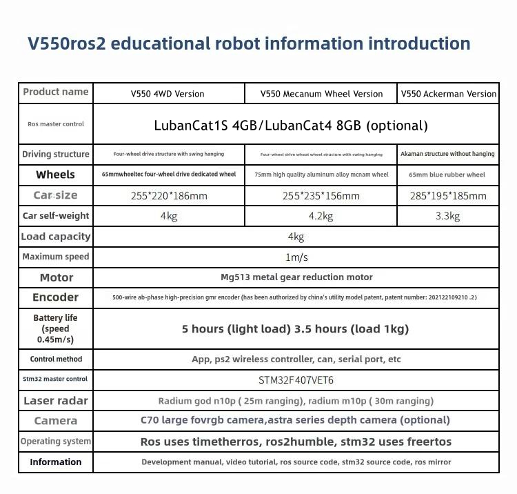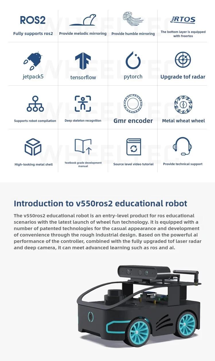 - The V550 ROS2 educational robot is a product launched based on the LubanCat series for ROS education scenarios. Through mature industrial design, it achieves a balance between simple appearance and easy development. Equipped with the RK3566 chip based LubanCat1S development board, it can meet the needs of ARM development and ROS beginner learning, and supports the long-term support version Humble system based on Ubuntu 22.04 ROS2. Equipped with the RK3588S chip based LubanCat4 development board, it can meet the needs of advanced robot development such as artificial intelligence. It provides ROS2 Humble Docker images that are ready to use.