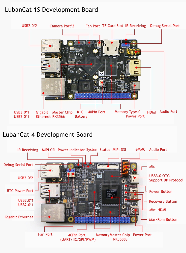 - Adopts domestic chip for Rockchip: The LubanCat1S adopts for Rockchip RK3566 chip, 22nm process technology, 1.8GHz main frequency, and integrates a quad-core 64 bit Cortex-A55 processor; The LubanCat4 adopts for Rockchip RK3588S chip, 8nm process technology, 2.4GHz main frequency, and is equipped with a quad core A76 + quad core A55 processor.