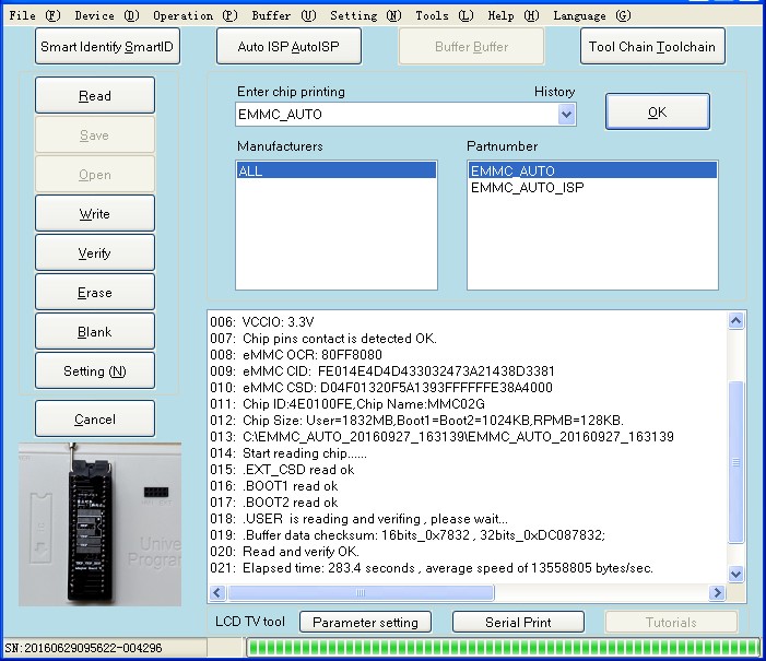 - Support automatic select for any series of flash including TSOP48-NAND-EMMC-PLCC, ETC. However programmer is driven by an easy-to-use control program with pull-down menu, hot keys and on-line help. Selecting of device is performed by its class, by manufacturer or simply by typing a fragment of vendor name and/or part number.