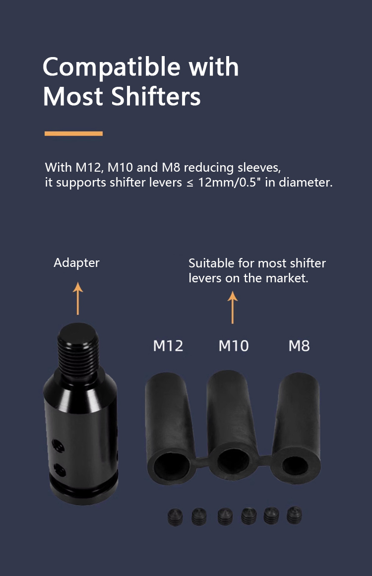 - Application: With M12, M10 and M8 reducing sleeves, it supports shifter levers ≤ 12mm/0.5" in diameter. It is compatible with most SIM shifters. It supports shifters for Simagic DS-8X, SIMVERTEX, ODDOR, Logitech, Thrustmaster TH8A, etc.
