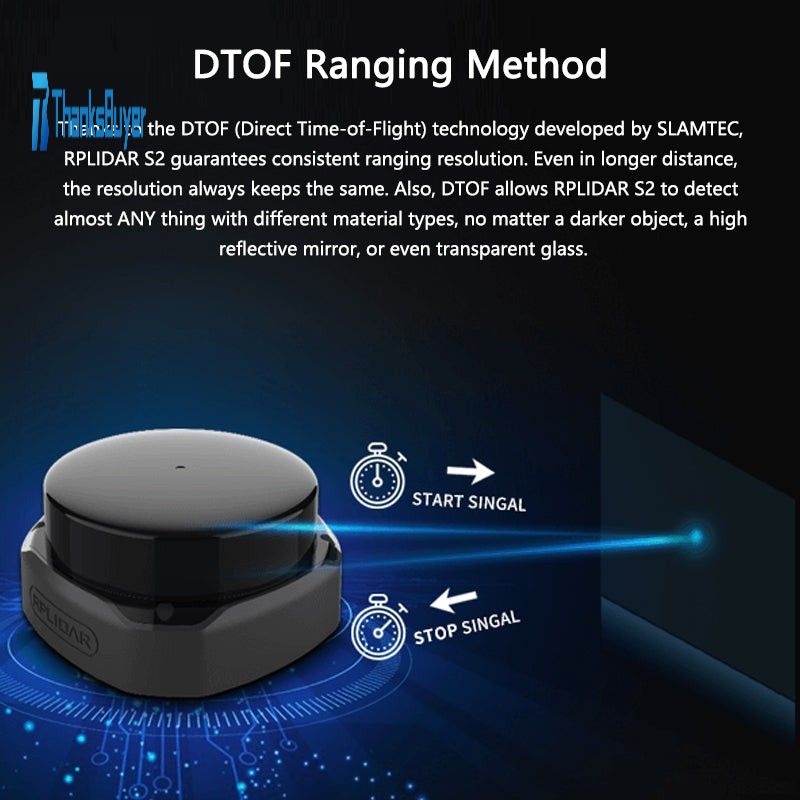 - DTOF Ranging Method: Thanks to the DTOF (Direct Time-of-Flight) technology developed by SLAMTEC, RPLIDAR S2 guarantees consistent ranging resolution. Even in longer distance, the resolution always keeps the same. Also, DTOF allows RPLIDAR S2 to detect almost ANY thing with different material types, no matter a darker object, a high reflective mirror, or even transparent glass.
