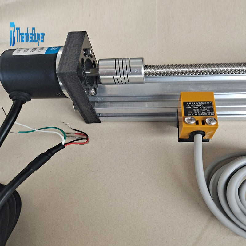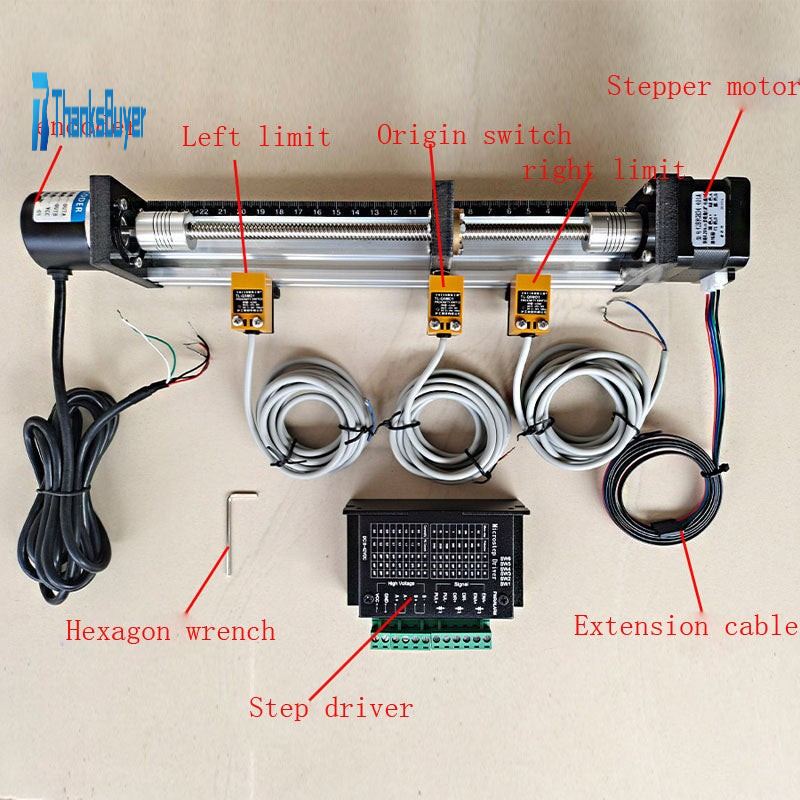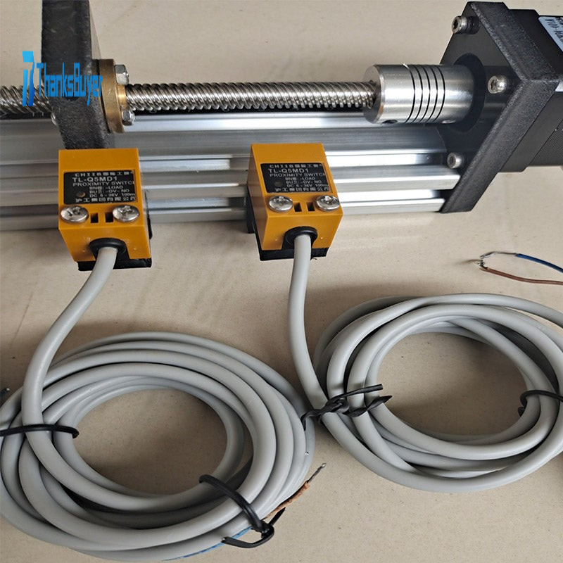 The total length is 340mm/13.4", its stroke is 195mm/7.7", and the pitch is 2mm/0.08". The lead screw is a 4-thread thread, and it moves 8mm/0.3" in one rotation. Use 42 stepper motor, with step angle 1.8°, incremental 600 line AB phase encoder. There are two-wired limit and a two-wired origin sensor on the left and right.