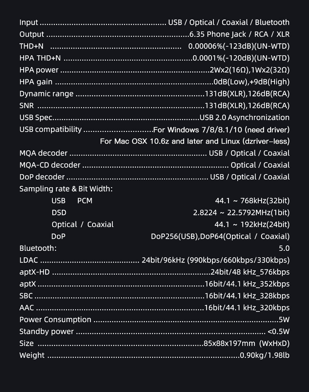 - USB, optical, coaxial support DSD and for MQA decode, coaxial and optical support DOP64 and for MQA-CD