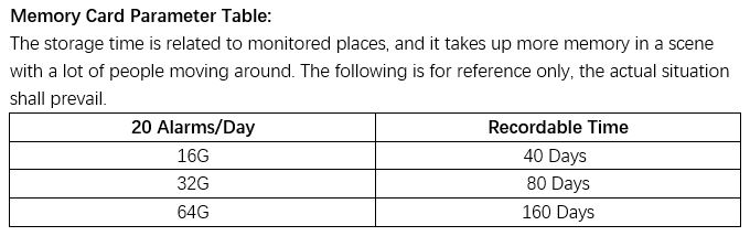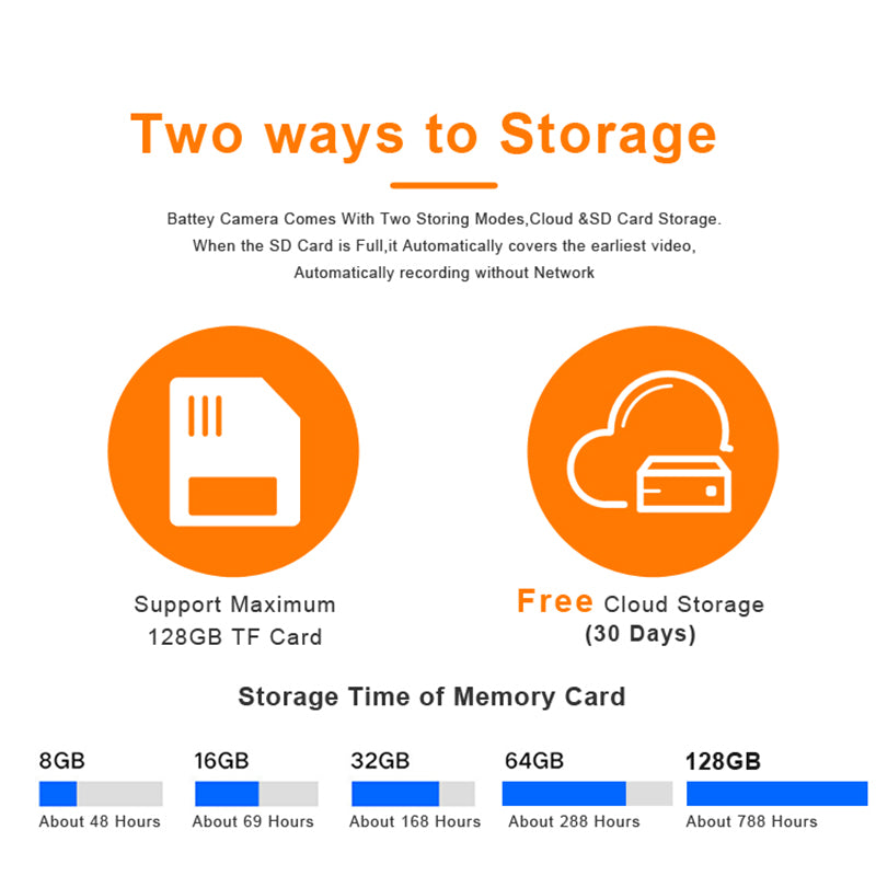 - Support TF card local storage (support up to 128G) and cloud storage.